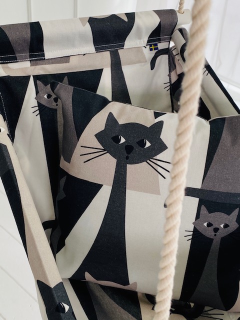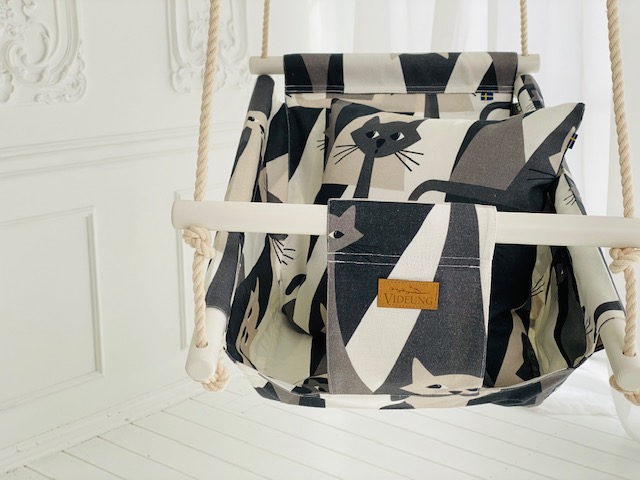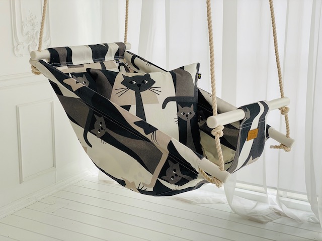 Nyfiken babygunga från Videung – en charmig och sofistikerad babygunga som lyfter hela hemmet. Katterna på gungan är något busiga! Färgerna som kombinerats är mjuk svart, grå, beige och vit som smälter ihop som handen i handsken. Tyget kommer från svenska Arvidssons textilier och är skön och härlig mot huden. En matchande kattkudde medföljer.