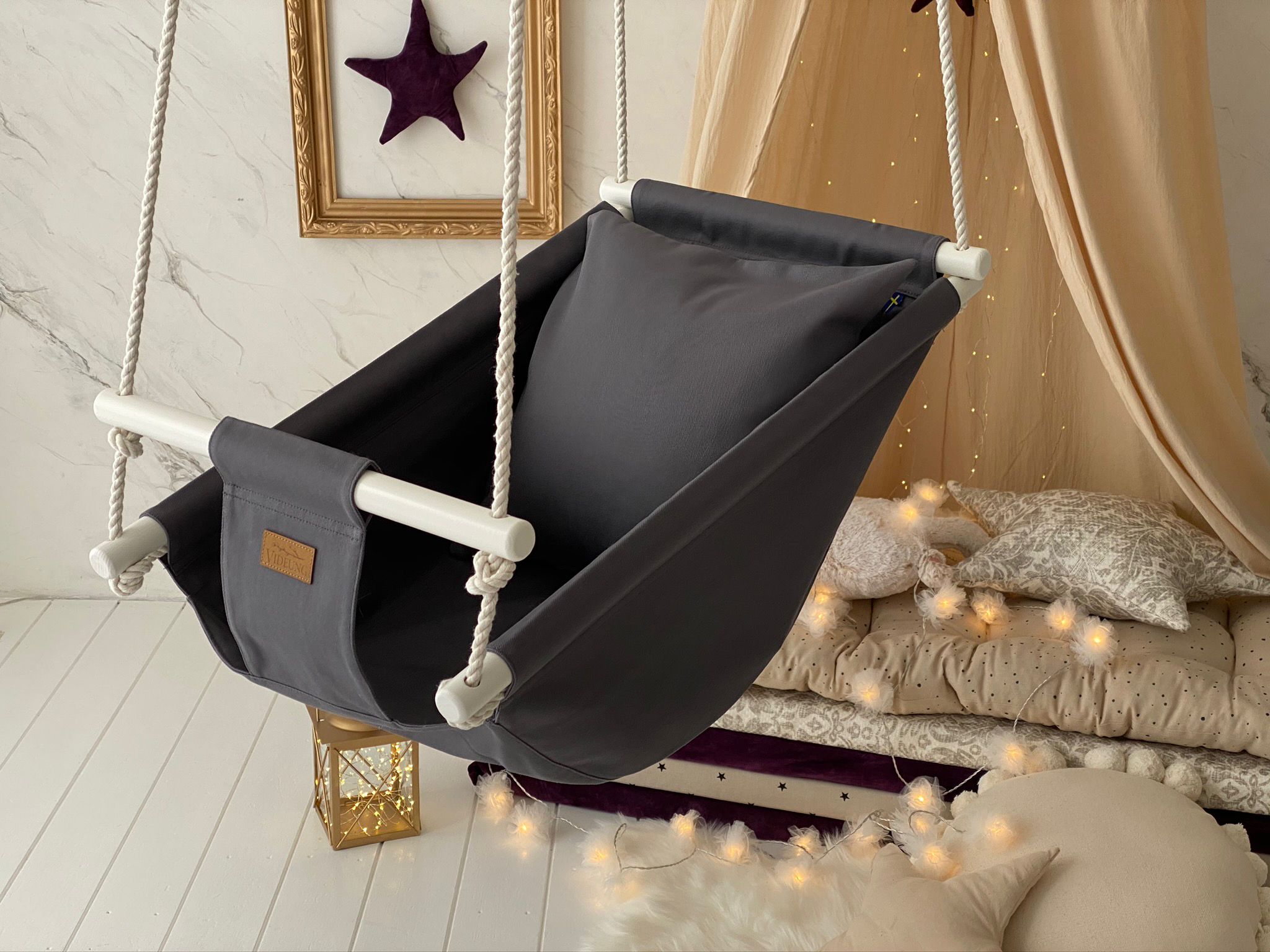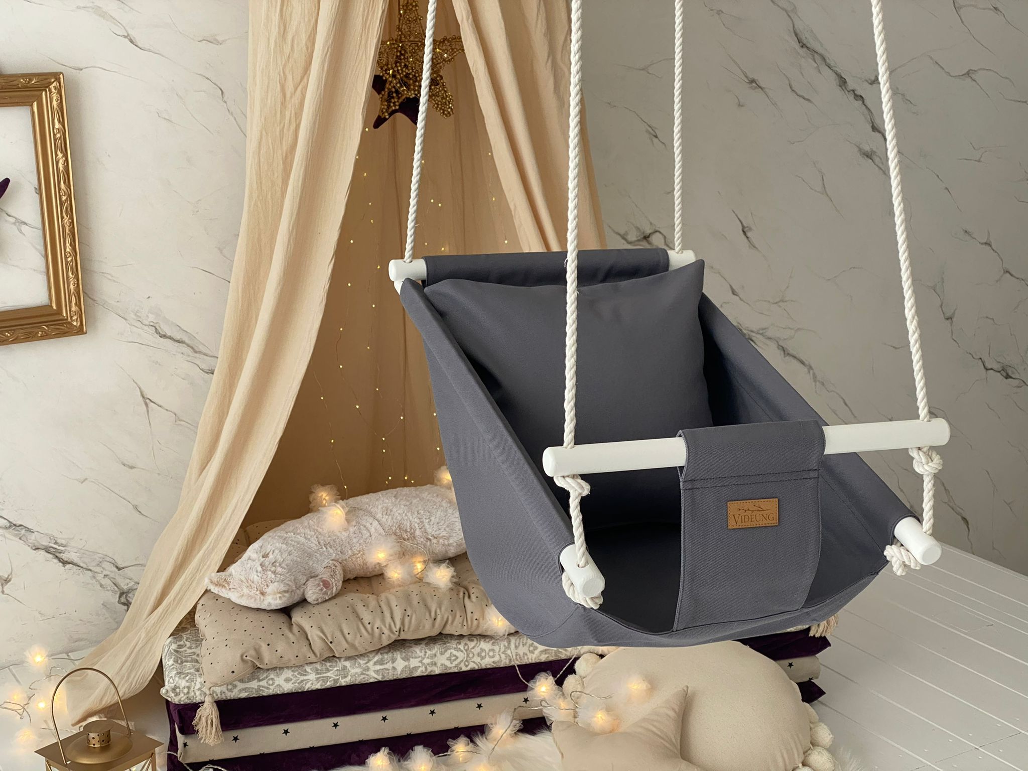 Färgen på babygungan är mörk-grå, tyget som vi använder är 100% bomull. Tyget för babygungan i trä är tvättbart och tål maskintvätt. Träpinnarna är tillverkade av björk och kan rengöras med en fuktig trasa. Bomullsrepen som medföljer är 2,5 m långa. Sist men inte minst – behöver du till exempel längre snören än vi erbjuder på standardbeställningar (2,5 m) är du varmt välkommen att höra av dig till oss så löser vi det.