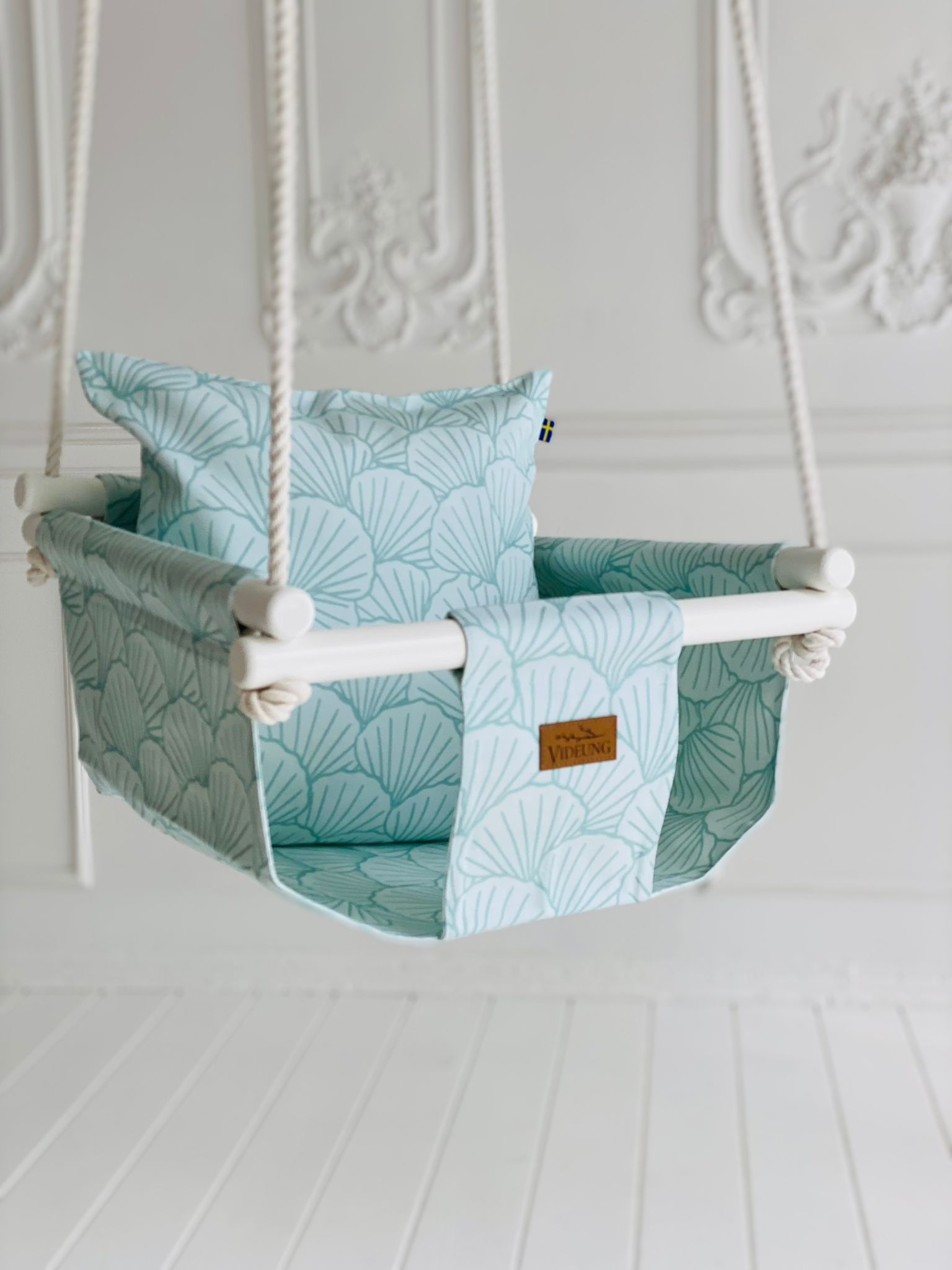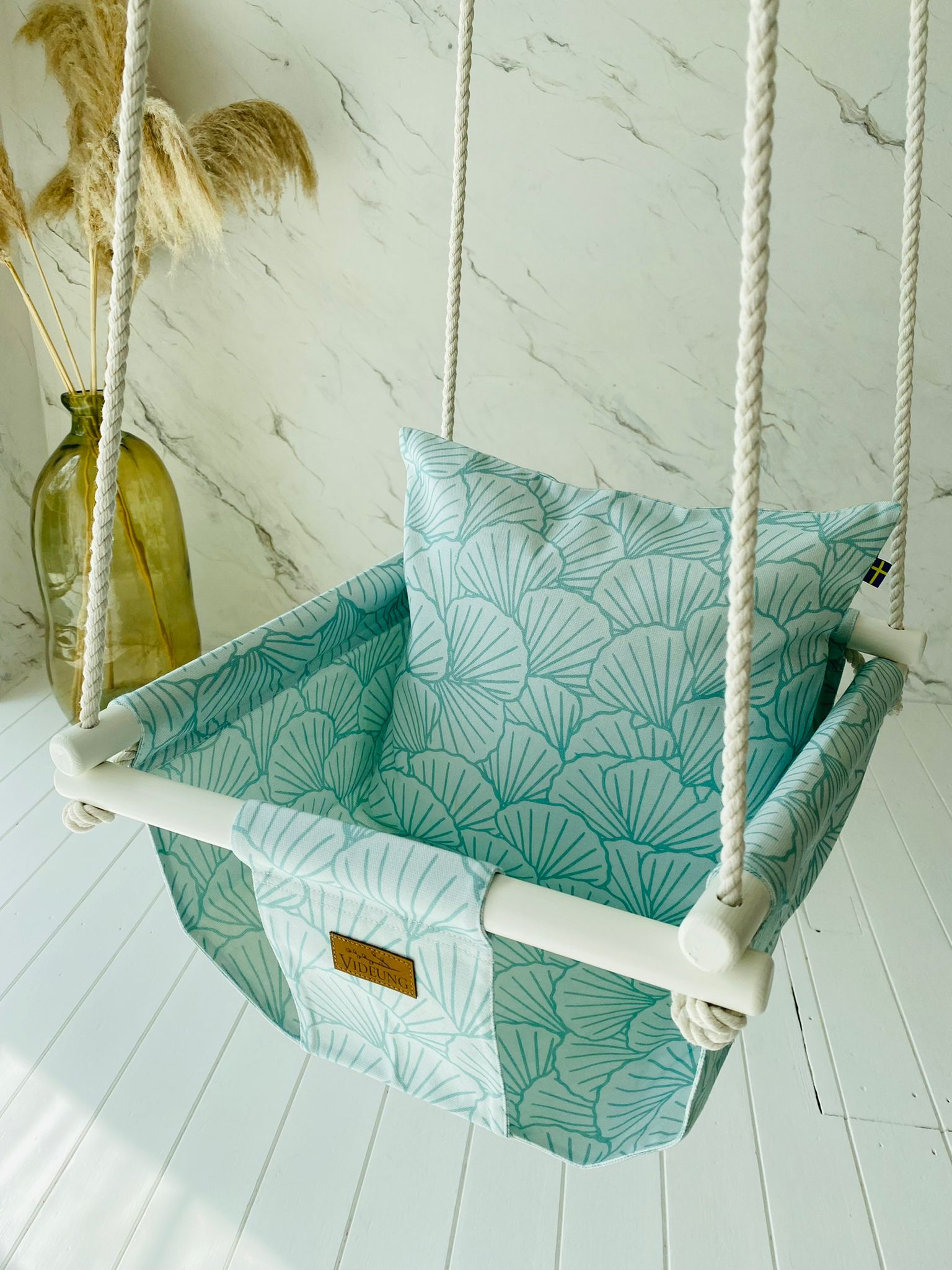 Barngunga Snäcka från Videung för barn från 6 månader upp till 3 år. Maximal vikt 25 kg. Passar utmärkt som ettårs-present. Barngungan är handtillverkad i EU. En bekväm och trygg inomhusgunga som barn verkligen älskar.